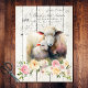 Cute, Dorper ewe and her kid behind a light pink and yellow floral bouquet. French country, vintage, victorian, lettering signage on a worn, white, wooden board background. Perfect for a rustic farmhouse or french country vibe, especially doing decoupage crafts.