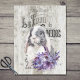 Cute, grey and white bunny with floppy ears behind a purple floral bouquet. French, vintage, victorian, lettering signage on a worn, white, wooden board background. Perfect for a rustic farmhouse vibe or doing decoupage crafts.