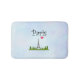 A bath mat with a whimsical drawing of the Eiffel Tower surrounded by green trees and pink watercolor heart floating in the air.