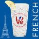 Fun drinking glass or stein for Valentine's Day featuring a heart shaped flag France. It is used to create the O in the word LOVE. The other letters are red. Above, in red letters, are the words THE YOUR NAME FAMILY. Change that to any text you like. Below are the words VALENTINE'S DAY 20??. Change the year. Or, change the text to whatever you wish. Great gift for a housewarming. Fun way for French people to celebrate their love of their heritage at Bastille Day or a family reunion, too.