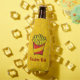 Cartoon illustration of small pack of french fries on yellow seamless junk food pattern background. Custom text.