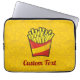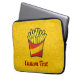 Cartoon illustration of small pack of french fries on yellow junk food seamless background. Custom text.