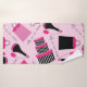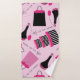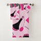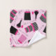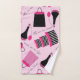 "French Glamour" is a lovely bath towel set including a wash cloth, hand, and bath towel. Displayed on a pink background, there are perfume bottles, purses and hat boxes. Place your order today!