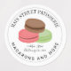 Circle logo with chocolate, pink, and green macarons with custom text for business name, address, and tagline with grey border.