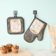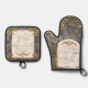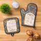 Some like it hot! But you can handle it in style with our sophisticated French style pot holder and/or oven mitt. These items coordinate with other products for kitchen and dining in our French Menu collection. The product designs feature fine cuisine courses and wines from a real vintage French restaurant menu. Borders are in shades of taupe, black, and cream in an elegant damask print, with the look of gilded accents,