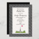 A bridal tea party invitation with a french theme. The background is composed of a cute black and white polka dot pattern. A white frame with a black border layered over top. A whimsical drawing with the Eiffel Tower in the background surrounded by green trees.