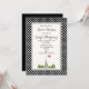 A sweet sixteen birthday party invitation with a french theme. The background is composed of a cute black and white polka dot pattern. A white frame with a black border layered over top. A whimsical drawing with the Eiffel Tower in the background surrounded by green trees.