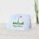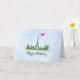 A happy birthday greeting card with a message inside. Designed with a whimsical drawing of the Eiffel Tower in the background surrounded by green trees. A light blue digital watercolor background.