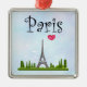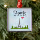 An ornament with a whimsical drawing of the Eiffel Tower surrounded by green trees and pink watercolor heart floating in the air. Light blue digital watercolor background.