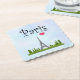 Paper coasters with a whimsical drawing of the Eiffel Tower surrounded by green trees and pink watercolor heart floating in the air. Light blue background.