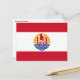 The flag of French Polynesia was adopted in 1984. Two red horizontal bands encase a wide white band; centred on the white band is a disc with a blue and white wave pattern depicting the sea on the lower half and a gold and white ray pattern depicting the sun on the upper half; a Polynesian canoe rides on the wave pattern; the canoe has a crew of five represented by five stars that symbolise the five island groups; red and white are traditional Polynesian colours.
