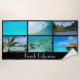 Beach towel with the image of a postcard with a collage with tropical photos of the pacific island of French Polynesia like Tahiti, Bora Bora and Moorea with a black frame and the text 'French Polynesia'.