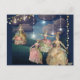 Four women in French royal Rococo fashion with hoop skirts dancing in a theater setting with dangling twinkling lights above. Magical