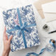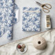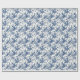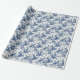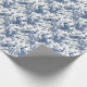 Pretty blue and white French Toile style wrapping paper features peacocks on branches, adding a touch of vintage elegance to any gift.