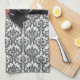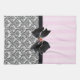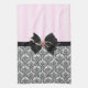 16” x 24” cotton twill kitchen towel with an image of pink on pink stripes on the top half, a black and white French baroque design on the bottom half, a black ribbon across the middle, and a big black bow with pink rose and ribbon detail. See matching cloth napkin, paper cocktail napkin, cloth placemat, paper placemat and coasters. See the entire Birthday Kitchen Towel collection in the FOOD/BEV | Linens section.