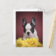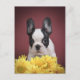 Frenchie - French bulldog puppy withe yellow flowers on red background