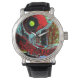 Elevate your style with this Black Vintage Leather Watch featuring Frequency Serpent. A serpentine red structure curves vertically across the dial, marked by circular elements resembling vibrational cores, while horizontal bands of blue, green, and white flow in the background like waves of data. The interplay of intense colors and curved forms creates dynamic tension, transforming this classic leather watch into a wearable canvas of digital abstract art. Perfect for everyday wear, gifting, or as a statement accessory.