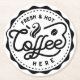 This hot beverage coaster features whimsical hand lettering that says "Fresh and Hot Coffee Here." on a white background. The lettering features decorative swashes and ornamental swirls with a scalloped border.