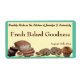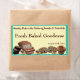 Perfect for those freshly baked goods. An image of brownies, quick bread, cookies and a muffin are tucked into the left lower portion of this label with a background of pale yellow all surrounded by a border and background of moderate turquoise green which make this a perfect label to use on your boxes of homemade baked goods. The text is in template form so you can change it to whatever you wish. If you want to leave the item name blank, just delete the text in that section.