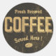 You cannot beat nice fresh brewed coffee and this design is a way of expressing that. It is a sign with the words fresh brewed coffee served here. It is written in a nice fond and set against a dark green background which is really effective. This fresh brewed coffee design looks great on these stickers. Perfect for yourself or as a gift