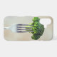 A vibrant piece of fresh broccoli pierced on the prongs of a fork, set against a softly blurred background.