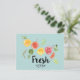 A postcard with a cute design featuring tumbling citrus fruits - lemons, limes and grapefruits. Trendy typography says "Fresh" with a cute squiggly underline.