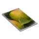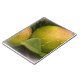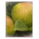 A delightful photograph of a pair of apples still on the tree, nestled amongst their green leaves. Raindrops cover their skin. The apples are ripening and have a nice mixture of shades ranging from bright green to orange and red.