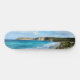 Pictured is a long view of aqua coloured sea waters breaking onto white sand,