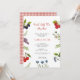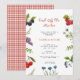 Cute farmers market fresh food inspired hand painted watercolor fruits and flowers 'Fresh off the market' Bridal shower Invitation with cute red and white gingham table cloth pattern in the back.
