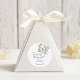 The sticker is made on wonderful paper and had no problem sticking to the bag that I purchased to put it on. I wanted to find a design that would be cute for the bride and groom and this one fit the bill as it has cute "bees" buzzing around and the wedding was taking place in a town called "Bee Cave". The packaging was great and protected the stickers. The website is easy to navigate and there are so many color choices. I had no problem finding a color that the bride was using on everything else selected. The design was adorable and there were many to choose from. You can make the figure as larger or smaller and you can place the photo and writting whereever you want to in the sticker. The printing is fabulous..better than expected.