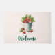 Welcome doormat with a summery graphic of a bunch of strawberries overflowing in a bucket.