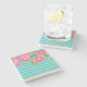 Fresh Pink Daisy Flowers on Turquoise Stripes Stone Coaster