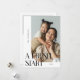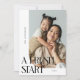 Modern New Year's photo template card featuring a text that says "a fresh start" with a curved frame picture. You can add another picture and a message on the back of the card. White and black.