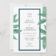 Tropical Beach Island Green Leaves Wedding Invitation with original paintings and trendy navy frame. Beautiful hand painted green leaves frame on a pink background creating a trendy, tropical and modern design. Beach Weddings and Island Weddings. Fresh and simple with a trendy navy frame.