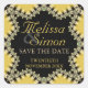Fresh and bold design in satin yellow and black, vintage gold decorative trims. Style themes would suit middle eastern, indian, bohemian, and all those seeking something different save the date stickers. Announce your special event with this Stylish and unique custom Wedding, Engagement, Anniversary Save the Date sticker. All the text can be fully customised, including style of font and colours.