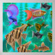 Design of male and female fantail guppies by Carolyn McFann of Two Purring Cats Studio on a quality art poster for tropical fish lovers.