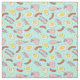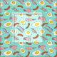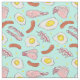 Light blue fabric with a fun food pattern of fried breakfast eggs, bacon and sausages