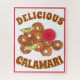 Design features an original marker illustration of fried calamari rings, served with lemon wedges and a side of marinara sauce. A classic pub appetizer and Italian restaurant food favourite.