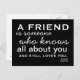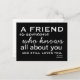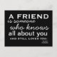 Inspirational postcard featuring the words of Elbert Hubbard "A Friend is someone who knows all about you and still loves you. From GotDonna and Donna Gotlib Designs. Printed by the fine folks at Zazzle.