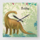 Original fine art design of a friendly Brachiosaurus dinosaur by artist Carolyn McFann of Two Purring Cats Studio printed on a quality and easily customisable wall clock for all who love dinosaurs, kids to adults.