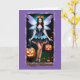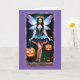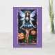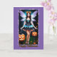 This whimsical Halloween card features a delightful fairy dressed in a vibrant and enchanting costume, perfect for celebrating the lighter side of Halloween. The fairy, with her sparkling lavender wings and a playful black and blue dress adorned with flower petals, stands amidst a glowing scene of carved pumpkins. Her joyful expression and floral crown add a touch of magic to the overall design, making her a captivating figure.