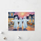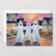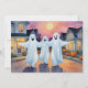 Three friendly ghosts celebrating Halloween on the street in a small town. Digital art.