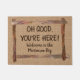 For RV campers who are always happy to see company at the door, this door mat says "Oh good, you're here!" and welcome to our rig. The last name of the family belonging to the rig can be customised, for a real personal touch. In whimsical, friendly dark brown type, inside a hand-drawn "tree branch" frame, all on a brown burlap look background. Make your mobile home a place your fellow camping buddies always feel at home.