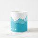 A bright and vibrant turquoise and white aviation industry mug tailored to the flight instructor, avionics technician, pilot, flight attendant, or aviation engineer. It features a bright turquoise theme with a miniature aeroplane soaring beside clouds. Next to this miniature plane is the unique name of the person in question.