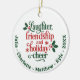 A white background. Personalise and add your names and a year. Quote: Laughter, friendship and holiday cheer. Green and red text.