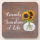 "Friends are the sunshine of life." three beautiful sunflowers in a vase on brown rustic hard plastic coaster.