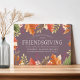Our charming and modern Thanksgiving dinner invitation beckons friends to celebrate "Friendsgiving" with you in style. Design features a border of painted watercolor autumn leaves, buds and branches, with your Friendsgiving details in the centre in white on a rich plum background.