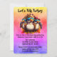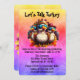 This "Let's Talk Turkey" Friendsgiving invitation brings a fun and festive vibe to your gathering with its playful design. The front features three turkeys wearing sunglasses and hats, set against a colourful gradient background with the bold caption "Let's Talk Turkey" at the top. The back of the invite showcases a colourful feather frame encircling a thoughtful message: "What is your favourite Friendsgiving memory?" It's perfect for adding a touch of humour and warmth to your celebration.