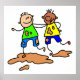 Cute cartoon whimsical illustration of two happy little boys from different ethnic backgrounds playing together in the mud. Easily customise and choose your own background colour or add text. Image available on various gifts and products.