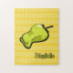 A yellow-green friggitello chilli pepper, also known as a Greek golden pepper or, in the US, pepperoncini when pickled, is decorated with patterns inspired by designs on ancient Greek amphorae and sits on a yellow background with a smaller version of the same pattern and a script label in the corner. This mild pepper was originally cultivated in Italy and is eaten throughout Europe and the United States.